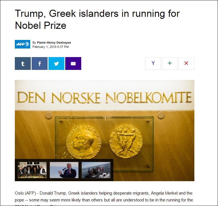 Ο Αμερικανός «Κροίσος», ο οποίος διεκδικεί ταυτόχρονα το χρίσμα των Ρεπουμπλικανών για την προεδρία των ΗΠΑ είναι υποψήφιος για το Νόμπελ Ειρήνης με το όνομα να φιγουράρει δίπλα σ’ αυτά των Ελλήνων νησιωτών που βοηθούν μ’ όλες τους τις δυνάμεις τους πρόσφυγες, την Άνγκελα Μέρκελ και τον Πάπα Φραγκίσκο.