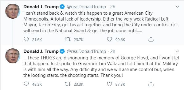 Ο Πρόεδρος των ΗΠΑ Ντόναλντ Τραμπ μέσω αναρτήσεων που έκανε στον προσωπικό λογαριασμό του στο Twitter απείλησε ότι θα στείλει την Εθνοφρουρά να “κάνει τη δουλειά όπως πρέπει” αν ο δήμαρχος δεν καταφέρει να ελέγξει την κατάσταση και διεμήνυσε ότι “όταν ξεκινήσει η λεηλασία, θα ξεκινήσουν και τα πυρά”.