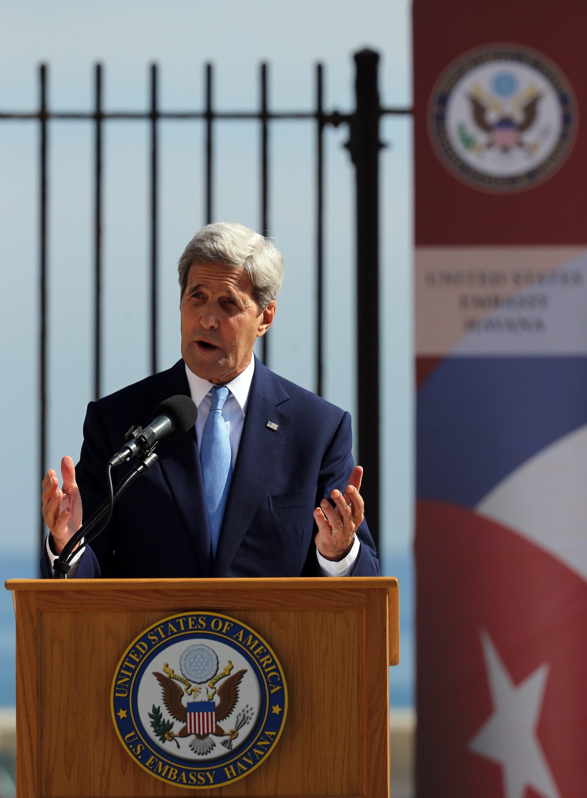 Σε ομιλία του πριν από την τελετή, ο Τζον Κέρι δήλωσε πως οι ΗΠΑ εξακολουθούν να υποστηρίζουν τις “δημοκρατικές αρχές και μεταρρυθμίσεις” στην Κούβα, αλλά οι Κουβανοί θα πρέπει να καθορίσουν οι ίδιοι το μέλλον της χώρας τους.