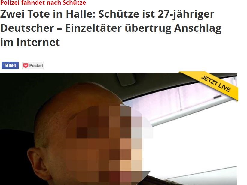 Σύμφωνα με τον Independent ο άνδρας, ο οποίος φέρεται να πραγματοποίησε την επίθεση, μιλώντας στα αγγλικά περιέγραψε τον εαυτό του ως «άγνωστο» και είπε ότι είναι αρνητής του Ολοκαυτώματος.Όπως αναφέρει ο Independent στη συνέχεια σημειώνει «ότι ο φεμινισμός είναι η αιτία της πτώσης του ποσοστού γεννήσεων στη Δύση» κάτι που σύμφωνα με όσα λέει «προκαλεί τη μαζική μετανάστευση» πριν καταλήξει ότι «ρίζα όλων των προβλημάτων είναι οι Εβραίοι». Σε ό,τι αφορά στην ταυτότητα του δράστη, όπως αναφέρει η Bild πρόκειται για 27χρονο νεοναζί Γερμανό και σε αντίθεση με όσα ανέφεραν νωρίτερα τα γερμανικά ΜΜΕ έδρασε μόνος του. Πηγή ΦΩΤΟ: focus.de