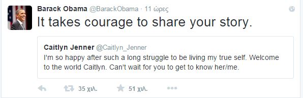 Αξιοσημείωτο είναι ότι το tweet της Κέιτλιν Τζένερ δεν έμεινε ασχολίαστο από τον Πρόεδρο των ΗΠΑ, Μπαράκ Ομπάμα ο οποίος της έγραψε: «Χρειάζεται μεγάλο κουράγιο για να μοιραστείς με όλους την ιστορία σου…!».