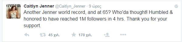 Ο πατριός της Κιμ Καρντάσιαν, Μπρους Τζένερ, που έγινε γυναίκα και ονομάζεται πλέον Κέιτλιν συγκέντρωσε ένα εκατομμύριο followers σε χρόνο dt στο twitter!