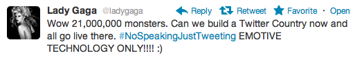 Η Lady Gaga έχει συνεχίζει να σπάει τα ρεκόρ στο Twitter, αφού έφτασε τους 21 εκατ. followers…Κι αμέσως έγραψε στο Twitter της: “Ουάου 21.000.000 τέρατα. Μπορούμε τώρα να χτίσουμε μια Twitter-χώρα ��αι να πάμε να ζήσουμε εκεί. #ΔενΜιλάωΑπλάTweetάρω ΣΥΝΑΙΣΘΗΜΑΤΙΚΗ ΤΕΧΝΟΛΟΓΙΑ ΜΟΝΟ”…