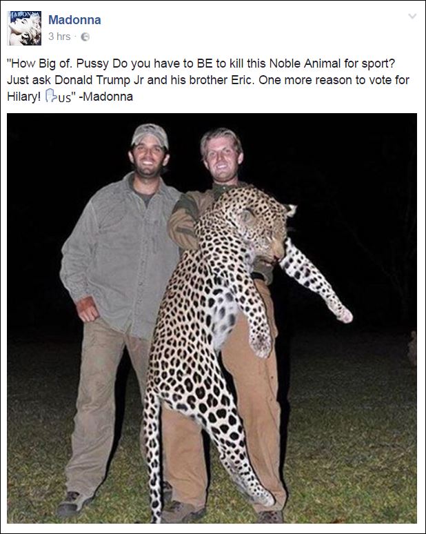 “Πόσο μ@@@@ς πρέπει να είσαι για να σκοτώσεις αυτό το ευγενικό ζώο; Απλά ρώτα τον Ντόναλντ Τραμπ junior και τον αδελφό του, Ερικ. Άλλος ένας λόγος να ψηφίσεις την Χίλαρι Κλίντον”.