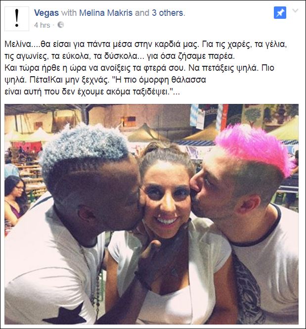 Τα υπόλοιπα μέλη της μπάντας, σχολιάζοντας την αποχώρηση της Μελίνας Μακρή, έγραψαν στην προσωπική σελίδα των Vegas στο Facebook: «Μελίνα….θα είσαι για πάντα μέσα στην καρδιά μας. Για τις χαρές, τα γέλια, τις αγωνίες, τα εύκολα, τα δύσκολα… για όσα ζήσαμε παρέα. Και τώρα ήρθε η ώρα να ανοίξεις τα φτερά σου. Να πετάξεις ψηλά. Πιο ψηλά. Πέτα! Και μην ξεχνάς.”Η πιο όμορφη θάλασσα είναι αυτή που δεν έχουμε ακόμα ταξιδέψει”».