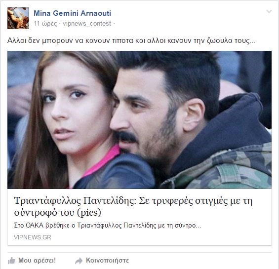 Αντιδράσεις έχει προκαλέσει η νέα ανάρτηση της Μίνας Αρναούτη στον προσωπικό της λογαριασμό στο Facebook.Η 30χρονη, η οποία επέβαινε στο μοιραίο τζιπ τη νύχτα που ο Παντελής Παντελίδης έχασε τη ζωή του, δεν σταματά να κάνει αναρτήσεις στα μέσα κοινωνικής δικτύωσης που να αφορούν στο συμβάν.Αυτή τη φορά, ανέβασε ένα άρθρο που αναφέρεται στον αδελφό του άτυχου τραγουδιστή, Τριαντάφυλλο Παντελίδη, ο οποίος είχε πάει να παρακολουθήσει έναν ποδοσφαιρικό αγώνα, παρέα με τη σύντροφό του.Η Αρναούτη μάλιστα έκανε ένα καυστικό σχόλιο για τον Τριαντάφυλλο Παντελίδη, γράφοντας: «Άλλοι δεν μπορούν να κάνουν τίποτα και άλλοι κάνουν την ζωούλα τους…».Επίσης, απαντώντας σε σχόλιο κάτω από τη δημοσίευση έγραψε, «Ξέρω πολλά, αλλά δεν μιλάω…».Δείτε την ανάρτηση: