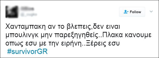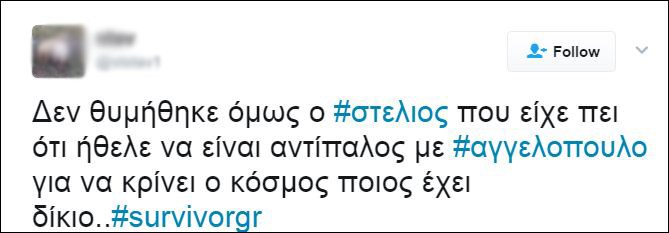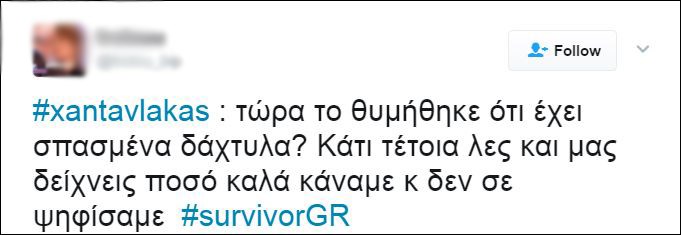 Η αποχώρηση του Στέλιου Χανταμπάκη από το Survivor έχει προκαλέσει το κοινό αίσθημα με τα μέσα κοινωνικής δικτύωσης να έχουν πάρει στην κυριολεξία «φωτιά».Η στάση του και η συμπεριφορά του εξόργισαν το τηλεοπτικό κοινό, που δεν τον ψήφισε για να παραμείνει. Ο Στέλιος Χανταμπάκης αποτελεί πλέον παρελθόν αλλά τα καυστικά σχόλια θα μείνουν στην ιστορία του παιχνιδιού, που έχει φανατίσει το κοινό που παρακολουθεί μανιωδώς το reality επιβίωσης.Πάρτε μια γεύση από τα καυστικά τιτιβίσματα των χρηστών του διαδικτύου