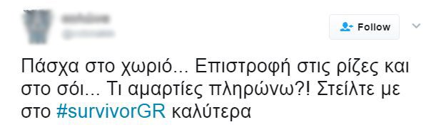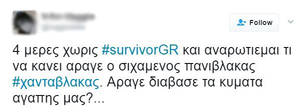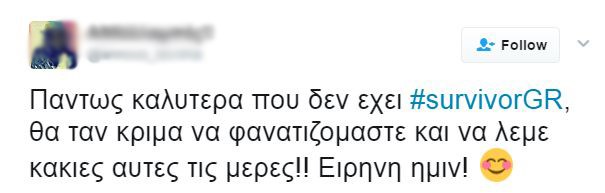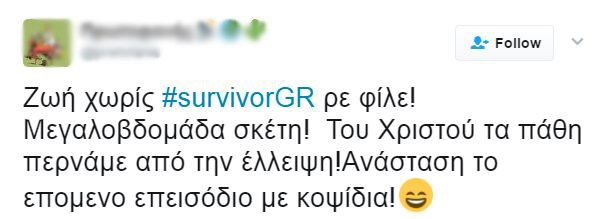 Αποτελεί κοινό τόπο ότι το Survivor έχει γίνει η πρώτη τηλεοπτική συνήθεια του κοινού, «γκρεμίζοντας» τις στατιστικές στα νούμερα τηλεθέασης.Ωστόσο, αυτές τις μέρες δεν γίνεται προβολή επεισοδίων του reality επιβίωσης, προκαλώντας την «αγανάκτηση» των χρηστών του ίντερνετ, οι οποίοι εκφράζουν τη στενοχώρια τους στα μέσα κοινωνικής δικτύωσης για το «ρεπό» του Survivor.