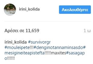 Η Ειρήνη Κολιδά μπορεί να επέστρεψε στην Ελλάδα, αλλά δεν ήταν δυνατόν να μην παρακολουθήσει τις προσπάθειες των συμπαικτών της στο Survivor.Η πρώην παίκτρια των «μαχητών» ανέβασε στο Instagram μια φωτογραφία από το σημερινό αγώνισμα, γράφοντας: «Μου λείπετε!!! Δεν γινόταν να μην σας δω!Με συγκινείτε απίστευτα!! Σας αγαπώ!!».