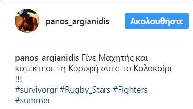 Ο πρώην «μαχητής» του Survivor, Πάνος Αργιανίδης ανακοίνωσε με διαφημιστικές αφίσες που ανέβασε στο Instagram ότι ετοιμάζει τα δικά του Survivor camps: «Γίνε μαχητής και κατέκτησε τη κορυφή αυτό το καλοκαίρι» αναφέρει η αφίσα, η οποία συμπληρώνεται από τις λέξεις: «Μαχητικότητα, Σκέψη, Στρατηγική, Πάθος για τη Νίκη, Ομαδικότητα, Δυναμισμός»!Πρόκειται για μια σειρά αγωνισμάτων ταχύτητας, δύναμης και στρατηγική σκέψης, βασισμένη σε δική του ιδέα, η οποία θα πραγματοποιηθεί σε όλη την Ελλάδα μετά τον τελικό του «Survivor» και μέχρι και τον Σεπτέμβριο σε πολλές κατασκηνώσεις της Ελλάδας.Τα παιδιά θα δοκιμάζονται σε διάφορα αθλήματα με βάση το οργανωτικό σχέδιο του μάνατζερ ράγκμπι, αλλά σε καμία περίπτωση δεν θα στερούνται το φαγητό.