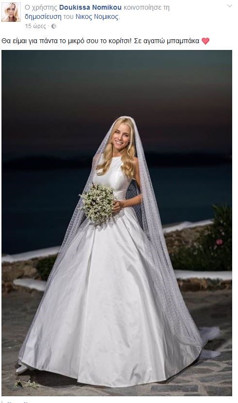 Ο Νίκος Νομικός έχει όπως κάθε πατέρας μεγάλη αδυναμία στην κόρη του, Δούκισσα. Ο γνωστός τραγουδιστής, λίγες ημέρες μετά τον γάμο της κόρης του έγραψε στο Facebook ένα ιδιαίτερα συγκινητικό μήνυμα.«Το γλυκό μου περιστεράκι…Καλή αρχή στη νέα σου ζωή παιδάκι μου καλό!! Η ευτυχία να σε συνοδεύει πάντα…», έγραψε ανεβάζοντας παράλληλα μια φωτογραφία με την Δούκισσα νυφούλα. Η Δούκισσα Νομικού κοινοποίησε την ανάρτησή του και του απάντησε: «Θα είμαι για πάντα το μικρό σου το κορίτσι! Σε αγαπώ μπαμπάκα»