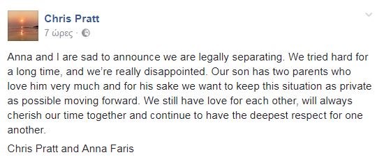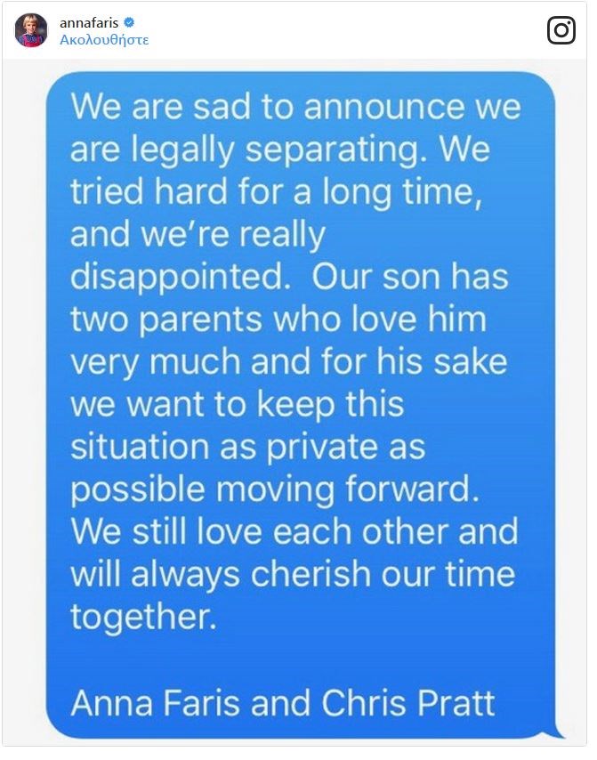 Σαν “βόμβα” έσκασε στη διεθνή σόου μπιζ, η είδηση του διαζυγίου ενός από τα πιο αγαπημένα ζευγάρια στο Χόλιγουντ, έπειτα από οκτώ χρόνια γάμου.Ο λόγος για τον Κρις Πρατ και την Άννα Φάρις, οι οποίοι αποφάσισαν να πάρουν χωριστούς δρόμους, όπως ανακοίνωσαν στα social media χθες το βράδυ.«Προσπαθήσαμε σκληρά για πολύ καιρό και είμαστε πραγματικά απογοητευμένοι», έγραψαν οι ηθοποιοί. «Ο γιος μας έχει δύο γονείς που τον αγαπούν πολύ και για το καλό του θέλουμε να κρατήσουμε αυτήν την κατάσταση όσο πιο ιδιωτική γίνεται, ενώ προχωρούμε μπροστά. Εξακολουθούμε να αγαπάμε ο ένας τον άλλο, θα έχουμε πάντα το διάστημα που περάσαμε μαζί και θα συνεχίσουμε να έχουμε σεβασμό ο ένας προς τον άλλο», αναφέρει η κοινή τους δήλωση. Ο Πρατ, που έγινε γνωστός μέσα από την ταινία “Φύλακες του Γαλαξία” και η Φάρις, που πρωταγωνιστεί στη σειρά του CBS “Mom,” παντρεύτηκαν το 2009 και έχουν έναν γιο τεσσάρων ετών.Δείτε τις αναρτήσεις:
