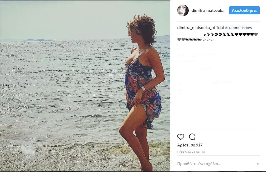Εντυπωσιάζει η ηθοποιός Δήμητρα Ματσούκα στη νέα φωτογραφία που ανέβασε στον προσωπικό της λογαριασμό στο Instagram.Η ηθοποιός ποζάρει με άκρως καλοκαιρινή διάθεση, φορώντας ένα αέρινο εμπριμέ φόρεμα, δίπλα στο κύμα.«Το καλοκαίρι είναι εδώ», ήταν η λεζάντα που συνόδευε την ανάρτηση της Δήμητρας Ματσούκα.