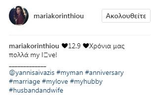 Επτά χρόνια γάμου γιορτάζουν σήμερα ο Γιάννης Αϊβάζης και η σύζυγός του Μαρία Κορινθίου.Οι δύο ηθοποιοί έχουν αποκτήσει μία κόρη, την Ισμήνη, ενώ δεν λείπουν οι δημόσιες εκδηλώσεις αγάπης και των δυο τους μέσω των social media.Η Μαρία Κορινθίου, ανέβασε σήμερα μία φωτογραφία από τον γάμο τους στον προσωπικό της λογαριασμό στο Instagram, λόγω της επετείου, παρόλο που ο σύζυγός της βρίσκεται στο ριάλιτι επιβίωσης “Survival”, και γνωρίζει πως δεν θα δει την ανάρτηση, αφού δεν έχει μαζί του κινητό τηλέφωνο.«12-9 Χρόνια μας πολλά! My love», ήταν η λεζάντα που συνόδευε την ανάρτηση της ηθοποιού.Δείτε την ανάρτηση: