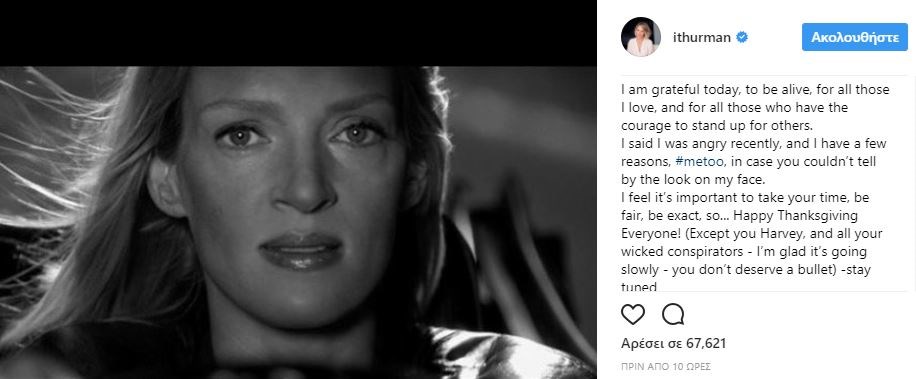 Χωρίς να ξεκαθαρίζει υπό ποιες συνθήκες έπεσε θύμα του κινηματογραφικού παραγωγού η Θέρμαν με αφορμή την Ημέρα των Ευχαριστιών έγραψε: “Νοιώθω ευγνώμων σήμερα που είμαι ζωντανή, για όλους όσους αγαπώ και για όλους αυτούς που έχουν το κουράγιο να στέκονται δίπλα σε άλλους”, ενώ αναφερόμενη σε μια συνέντευξη που έδωσε τον Οκτώβριο και κατά την οποία είχε δηλώσει πολύ θυμωμένη για να συζητήσει το σκάνδαλο Γουάινστιν η Ούμα Θέρμαν συνέχισε “είπα πρόσφατα ότι ήμουν οργισμένη και έχω αρκετούς λόγους για αυτό #metoo, εάν δεν μπορείτε να το καταλάβετε από το ύφος στη φωτογραφία μου”.