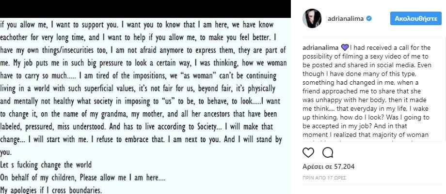 Σε μακροσκελές μήνυμα της στον προσωπικό της λογαριασμό στο Instagram εξηγεί τι την οδήγησε στο να πάρει αυτή την απόφαση σημειώνοντας: “Μόλις δέχθηκα ένα τηλεφώνημα για το ενδεχόμενο να γυρίσω ένα σέξι βίντεο προκειμένου να αναρτηθεί στα social media. Αν και έχω κάνει πολλά τέτοια βίντεο, κάτι άλλαξε μέσα μου όταν μία φίλη με προσέγγισε προκειμένου να μοιραστεί μαζί μου τη δυσαρέσκειά της για το σώμα της και τότε σκέφτηκα… ότι κάθε ημέρα της ζωής μου ξυπνάω με τη σκέψη, πώς φαίνομαι; Θα είμαι αποδεκτή στον χώρο εργασίας μου; Και αυτή τη στιγμή συνειδητοποίησα ότι η πλειοψηφία των γυναικών πιθανότατα ξυπνούν κάθε πρωί προσπαθώντας να ανταποκριθούν σε στερεότυπα που επιβάλλονται από την κοινωνία, τα social media και τη μόδα. Σκέφτηκα ότι αυτός δεν είναι τρόπος για να ζεις, δεν είναι υγιές ούτε σωματικά ούτε πνευματικά, οπότε αποφάσισα να κάνω την αλλαγή… Δεν θα βγάλω ξανά τα ρούχα μου για έναν κενό σκοπό”.