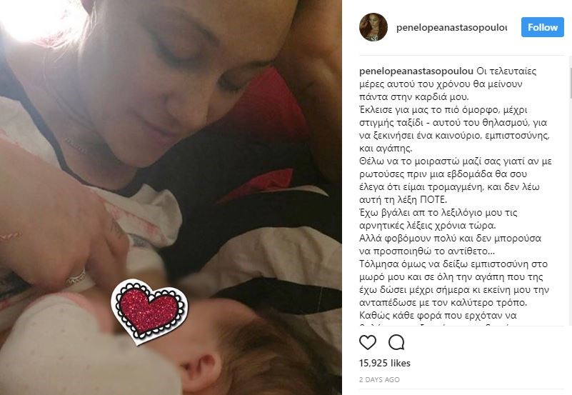 «Οι τελευταίες μέρες αυτού του χρόνου θα μείνουν πάντα στην καρδιά μου. Έκλεισε για μας το πιο όμορφο, μέχρι στιγμής ταξίδι – αυτού του θηλασμού, για να ξεκινήσει ένα καινούριο, εμπιστοσύνης, και αγάπης. Θέλω να το μοιραστώ μαζί σας γιατί αν με ρωτούσες πριν μια εβδομάδα θα σου έλεγα ότι είμαι τρομαγμένη, και δεν λέω αυτή τη λέξη ΠΟΤΕ. Έχω βγάλει απ’ το λεξιλόγιο μου τις αρνητικές λέξεις χρόνια τώρα. Αλλά φοβόμουν πολύ και δεν μπορούσα να προσποιηθώ το αντίθετο…», έγραψε η Πηνελόπη Αναστασοπούλου και προσέθεσε: