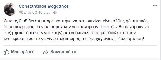 «Όποιος διαδίδει ότι μπορεί να πήγαινα στο Survivor είναι αήθης ή/και κακός δημοσιογράφος -δεν με πήραν καν να τσεκάρουν. Ποτέ δεν θα δεχόμουν να συζητήσω α) το Survivor και β) με ένα κανάλι, που με έδιωξε από την ενημέρωσή του, το να γίνω ταλαίπωρος της «ψυχαγωγίας». Καλή φώτιση!», έγραψε ο Κωνσταντίνος Μπογδάνος.