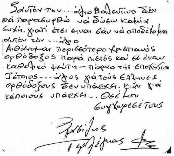 “Σ’ αυτόν τον Άγιο Βαλεντίνο δεν θα παρασυρθώ να δώσω καμία ευχή, γιατί έτσι θα είναι σαν να αποδέχομαι αυτόν τον… άγιο. Αισθάνομαι περισσότερο Χριστιανός Ορθόδοξος, παρά πιστός σε έναν καθολικό ψεύτη – πόρνο της εποχής. Τέτοιος… άγιος για τους Έλληνες Ορθόδοξους δεν υπάρχει. Κι αν για κάποιους υπάρχει… Θεέ μου, συγχώρεσέ τους”, έγραψε ο Βασίλης Τερλέγκας σε ανάρτηση του στο Facebook.