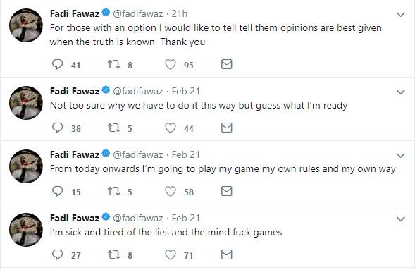 Έτσι, το απόγευμα της Τετάρτης, ο Φαουάζ ανάρτησε μία ανοιχτή επιστολή που απευθύνεται στον τραγουδιστή, με τη μορφή 12 έντονα φορτισμένων tweet. «Αγαπητέ Τζορτζ, βαρέθηκα και σιχάθηκα να διεκδικώ τα δικαιώματά μου από δικηγόρους. Πάμε πάλι από το μηδέν. Ούτε λεφτά, ούτε προσπάθεια, ούτε τίποτα, επειδή απλά είμαι ευγενικός απέναντί σου. Ε, λοιπόν, τέλος οι ευγένειες. Παρακαλώ τα μέσα να είναι έτοιμα για να τους πω την ιστορία μου. Σας παρακαλώ να έρθετε σε επικοινωνία μαζί μου για να σας πω ό,τι ξέρω», έγραψε, μεταξύ άλλων, ο Φαουάζ, προειδοποιώντας στην ουσία την οικογένεια του Τζορτζ Μάικλ ότι, αν δεν του δώσει κάτι, θα τους κάνει … λαϊκό ανάγνωσμα.