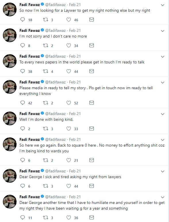 Ξεσπάθωσε μέσω Twitter ο τελευταίος σύντροφος του Τζορτζ Μάικλ, που υπόσχεται ότι δεν θα κρατήσει το στόμα του κλειστό και θα πει την ιστορία της σχέσης του με τον διάσημο τραγουδιστή, ώστε να τη μάθει όλος ο κόσμος. Ο Φαντί Φαουάζ βρίσκεται σε πόλεμο με τους δικηγόρους του Μάικλ από τη μέρα που τον βρήκε νεκρό. Ο 41χρονος φωτογράφος έχει παραδεχτεί δημοσίως ότι έχει κόντρα με την οικογένεια του νεκρού συντρόφου του για το θέμα της διαθήκης του.