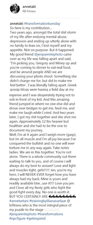 Η Αννέτ Αρτάνι δημοσίευσε δύο φωτογραφίες της στο instagram. Στην πρώτη φωτογραφία έδειχνε το σκελετωμένο κορμί της πριν από δύο περίπου χρόνια και στη δεύτερη το πώς κατάφερε να αποκτήσει ένα νέο και υγιές πλέον σώμα.