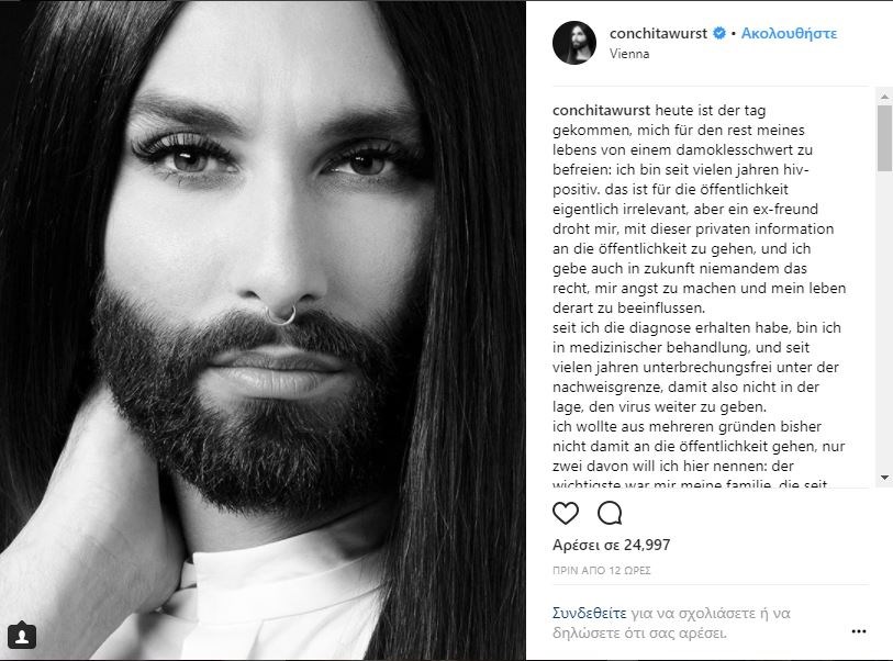 Ο λόγος για την Κοντσίτα Βουρστ, η οποία δήλωσε ότι είναι φορέας του HIV. Η τραγουδίστρια με τα μούσια, είχε προκαλέσει ποικίλες αντιδράσεις με την εκκεντρική εμφάνισή της στον ευρωπαϊκό διαγωνισμό τραγουδιού, πριν από λίγα χρόνια. Τότε, είχε εκπροσωπήσει την Αυστρία και είχε κερδίσει με το τραγούδι “Rise like a Phoenix”.