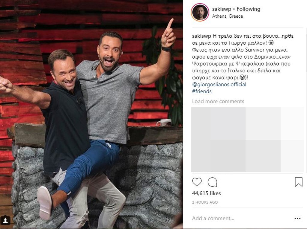Το μεγάλο ταξίδι του Survivor ολοκληρώνεται απόψε με τον τελικό όπου θα αναδειχθεί ο νικητής του παιχνιδιού που θα κερδίσει το έπαθλο των 100.000 ευρώ. Λίγες ώρες πριν τον μεγάλο τελικό του Survivor, ο Σάκης Tανιμανίδης δημοσίευσε μια φωτογραφία στο Instagram από τον χθεσινό ημιτελικό, στην οποία τον βλέπουμε με τον Γιώργο Λιανό και έγραψε: “Η τρέλα δεν πει στα βουνά…ήρθε σε ‘μένα και το Γιώργο μάλλον! Φέτος ήταν ένα άλλο Survivor για ‘μένα, αφού είχα έναν φίλο στο Δομίνικο…έναν Ψαροτουφεκά με Ψ κεφαλαίο (καλά που υπήρχε και το Ιταλικό εκεί δίπλα και φάγαμε κανά ψάρι)! @giorgoslianos.official #friends”.