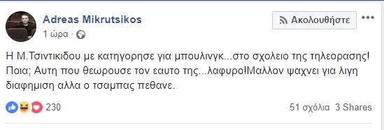Την απάντησή του έδωσε ο Ανδρέας Μικρούτσικος στη Μαρίνα Τσιντικίδου μέσω facebook. Όπως έγραψε σε ανάρτησή του, “η Μ. Τσιντικίδου με κατηγόρησε για μπούλινγκ…στο σχολείο της τηλεόρασης!Ποια; Αυτή που θεωρούσε τον εαυτό της… λάφυρο! Μάλλον ψάχνει για λίγη διαφήμιση αλλά ο τσάμπας πέθανε”.