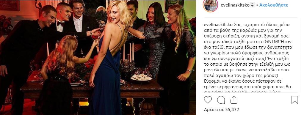 Η Εβελίνα Σκίτσκο ανέβασε στον προσωπικό της λογαριασμό στο Instagram μία φωτογραφία της από το GNTM και έγραψε: “Σας ευχαριστώ όλους μέσα από τα βάθη της καρδιάς μου για την υπέροχη στήριξη, αγάπη και δύναμη σας στο μοναδικό ταξίδι μου στο GNTM! Ήταν ένα ταξίδι που μου έδωσε την δυνατότητα να γνωρίσω πολύ όμορφους ανθρώπους και να συνεργαστώ μαζί τους! Ένα ταξίδι το οποίο με βοήθησε στην εξέλιξή μου ως μοντέλο και με έκανε να καταλάβω πόσο πολύ αγαπάω τον χώρο της μόδας! Εύχομαι να έκανα όσους πίστεψαν σε εμένα περήφανους και υπόσχομαι πως θα συνεχίσω να δουλεύω σκληρά! Τώρα αρχίζουν όλα! Σας αγαπώ πολύ”.