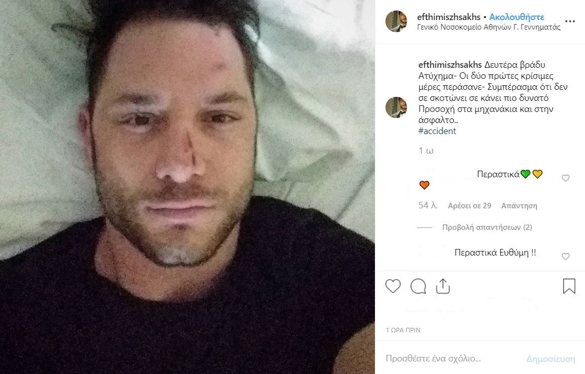 Στο “Γ. Γεννηματάς” νοσηλεύεται από τη Δευτέρα ο Ευθύμης Ζησάκης ο οποίος φαίνεται πως είχε τροχαίο ατύχημα. Σε φωτογραφία που ανήρτησε ο ίδιος ο ηθοποιός στο isntagram, απεικονίζεται να έχει κάποια ελαφρά τραύματα στο πρόσωπο.