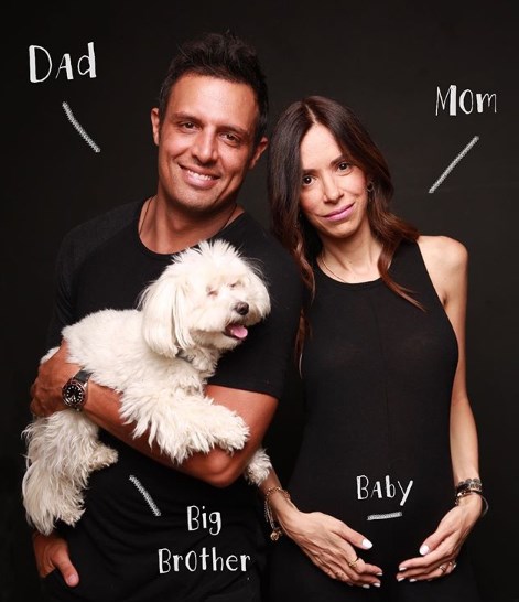 Στη φωτογραφία το ζευγάρι είναι με τον σκύλο τους και η Αρετή Θεοχαρίδη κρατά τη φουσκωμένη της κοιλίτσα.