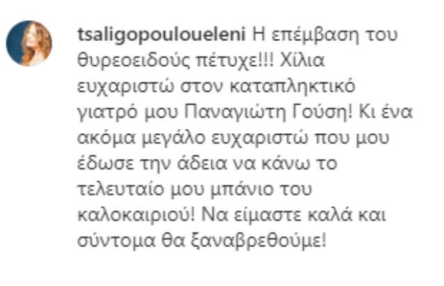 «Η επέμβαση του θυρεοειδούς πέτυχε!!! Χίλια ευχαριστώ στον καταπληκτικό γιατρό μου Παναγιώτη Γούση! Κι ένα ακόμα μεγάλο ευχαριστώ που μου έδωσε την άδεια να κάνω το τελευταίο μου μπάνιο του καλοκαιριού! Να είμαστε καλά και σύντομα θα ξαναβρεθούμε!», έγραψε χαρακτηριστικά στη λεζάντα της ανάρτησής της η Ελένη Τσαλιγοπούλου.