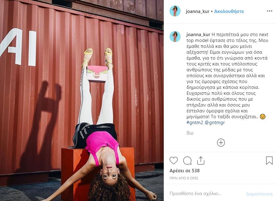 “Η περιπέτειά μου στο next top model έφτασε στο τέλος της. Μου έμαθε πολλά και θα μου μείνει αξέχαστη! Είμαι ευγνώμων για όσα έμαθα, για το ότι γνώρισα από κοντά τους κριτές και τους υπόλοιπους ανθρώπους της μόδας με τους οποίους και συνεργάστηκα αλλά και για τις όμορφες σχέσεις που δημιούργησα με κάποια κορίτσια. Ευχαριστώ πολύ και όλους τους δικούς μου ανθρώπους που με στήριξαν αλλά και όσους μου έστειλαν όμορφα σχόλια και μηνύματα! Το ταξίδι συνεχίζεται”, έγραψε η Ιωάννα σε ανάρτησή της στο Instagram μετά την αποχώρηση της από το GNTM.