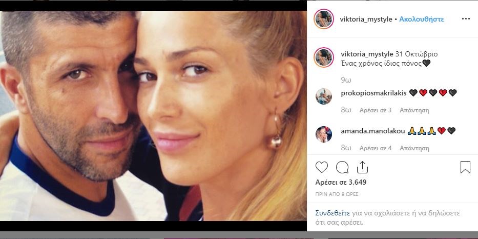 Το ημερολόγιο έγραφε 31 Οκτωβρίου 2018 όταν ο Γιάννης Μακρής έπεφτε νεκρός έξω από το σπίτι του στη Βούλα. Η σύζυγός του δεν μπορεί να ξεπεράσει τον βαθύ πόνο έως και σήμερα. Η Βικτώρια Καρύδα ανέβασε στο Instagram δύο φωτογραφίες όπου ποζάρουν μαζί και ευτυχισμένοι. Στη μία εξ αυτών γράφει “Ένας χρόνος, ίδιος πόνος”.