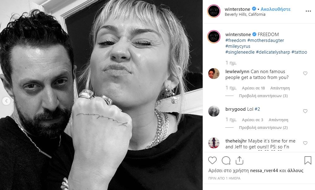 Η διάσημη τραγουδίστρια “χτύπησε” στο χέρι της τη λέξη ‘ελευθερία’. Σε φωτογραφίες που ανέβασε στον λογαριασμό του στο Instagram ο γνωστός tattoo artist Winter Stone φαίνεται η Μάιλι Σάριους να δείχνει όλο καμάρι το νέο της “απόκτημα”.