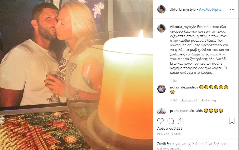 “Εκεί που είναι όλα όμορφα ξαφνικά έρχεται το τέλος. Αξέχαστη άσχημη στιγμή που μένει στην καρδιά μου…να βλέπεις Τον αγαπούλη σου στο νεκροταφείο και να φιλάς τα μωβ χειλάκια του και να χαϊδεύεις το Ραμμένο το κεφαλάκι του…πώς να ξεπεράσεις όλο Αυτό?! ‘Εχω και πόνο τον παιδιών μου.Τι άσχημο πράγμα! Δεν έχω λόγια… Τι κακία υπάρχει στο κόσμο…”