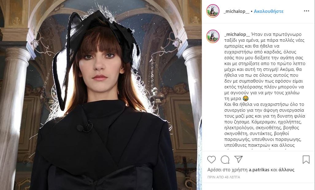 Η πρώην παίκτρια του GNTM ανέβασε μία φωτογραφία στον προσωπικό της λογαριασμό στο Instagram από την τελευταία δοκιμασία, και έγραψε: “Ήταν ένα πρωτόγνωρο ταξίδι για εμένα, με πάρα πολλές νέες εμπειρίες και θα ήθελα να ευχαριστήσω από καρδιάς, όλους εσάς που μου δείξατε την αγάπη σας και με στηρίξατε από το πρώτο λεπτό μέχρι και αυτή τη στιγμή! Ακόμα, θα ήθελα να πω σε όλους αυτούς που δεν με συμπαθούν πως εφόσον είμαι εκτός τηλεόρασης πλέον μπορούν να με αγνοούν για να μην τους χαλάω τη μέρα. Και θα ήθελα να ευχαριστήσω όλο το συνεργείο για την άψογη συνεργασία τους μαζί μας και για τη δυνατή φιλία που ζήσαμε. Κάμεραμαν, ηχολήπτες, ηλεκτρολόγοι, σκηνοθέτης, βοηθός σκηνοθέτη, συντάκτες, βοηθοί παραγωγής, υπεύθυνοι παραγωγής, υπεύθυνες παικτριών και άλλους τόσους που ήταν εκεί για εμένα. Σας έλειψα;”