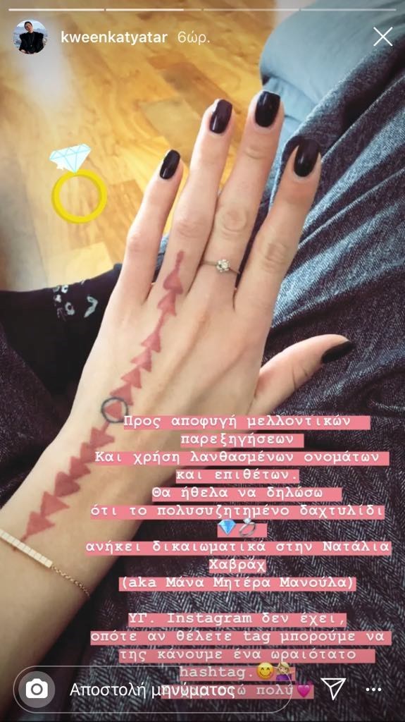 Η Κάτια, όμως, έσπευσε να ξεκαθαρίσει την κατάσταση και όπως έγραψε «Προς αποφυγή μελλοντικών παρεξηγήσεων και χρήση λανθασμένων ονομάτων και επιθέτων. Θα ήθελα να δηλώσω ότι το πολυσυζητημένο δαχτυλίδι ανήκει δικαιωματικά στην Ναταλία Χαβράχ (aka μάνα μητέρα μανούλα)».