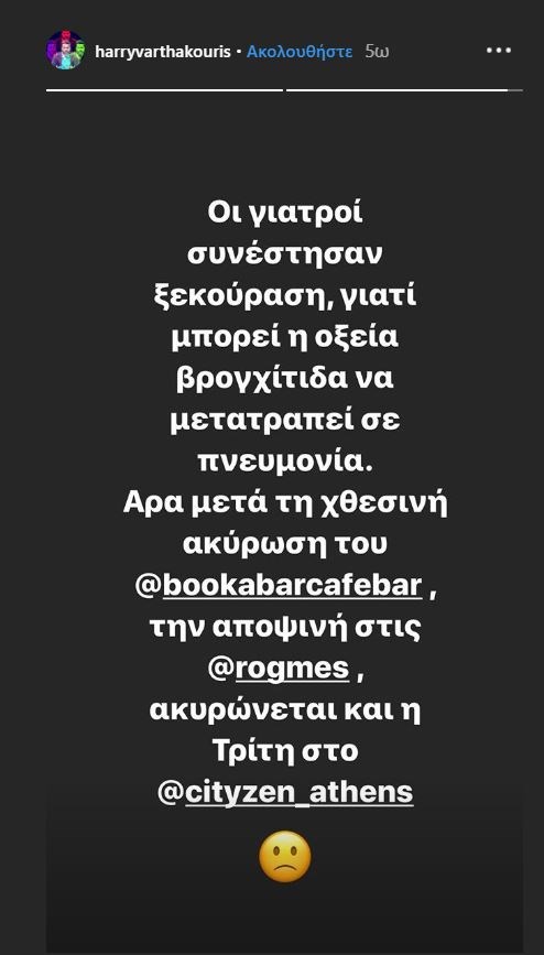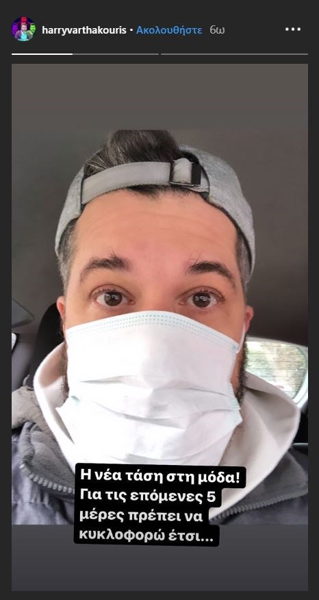 Με μάσκα πρέπει να κυκλοφορεί για πέντε ημέρες ο Χάρης Βαρθακούρης όπως ο ίδιος ενημέρωσε τους ακολούθους του μέσω insta story.