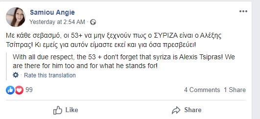 Η Άντζυ Σαμίου αναφέρει χαρακτηριστικά: “με κάθε σεβασμό, οι 53+ να μην ξεχνούν πως ο ΣΥΡΙΖΑ είναι ο Αλέξης Τσίπρας! Κι εμείς για αυτόν είμαστε εκεί και για όσα πρεσβεύει!”.