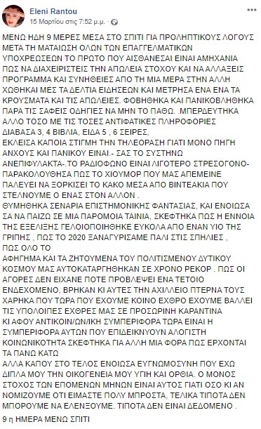 «Μένω ήδη 9 μέρες μέσα στο σπίτι για προληπτικούς λόγους. Μετά τη ματαίωση όλων των επαγγελματικών υποχρεώσεων το πρώτο που αισθάνεσαι είναι αμηχανία πώς να διαχειριστείς την απώλεια στόχου και να αλλάξεις πρόγραμμα και συνήθειες από τη μια στην άλλη. Χώθηκα μέσα στα δελτία ειδήσεων και μέτρησα ένα ένα τα κρούσματα και τις απώλειες. Φοβήθηκα και πανικοβλήθηκα παρά τις σαφείς οδηγίες να μην το πάθω. Μπερδεύτηκα άλλο τόσο με τις αντιφατικές πληροφορίες. Διάβασα 3, 4 βιβλία, είδα 5, 6 σειρές έκλεισα την τηλεόραση γιατί μόνο πηγή άγχους και πανικού είναι – σας το συστήνω ανεπιφύλακτα – το ραδιόφωνο είναι λιγότερο στρεσογόνο», γράφει χαρακτηριστικά η Ελένη Ράντου.