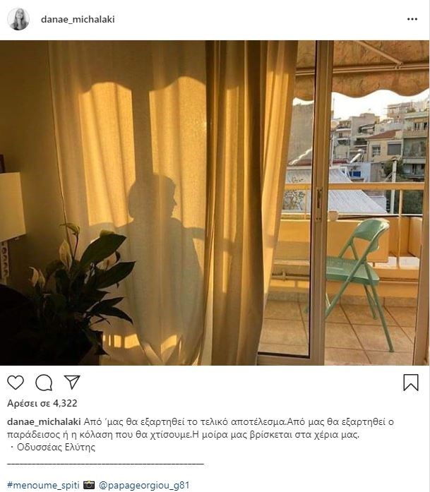 Ο Γιώργος Παπαγεωργίου φωτογράφισε την Δανάη Μιχαλάκη πίσω από την κουρτίνα, την ώρα που εκείνη κάθεται στο μπαλκόνι και ρεμβάζει. «Από μας θα εξαρτηθεί το τελικό αποτέλεσμα.Από μας θα εξαρτηθεί ο παράδεισος ή η κόλαση που θα χτίσουμε.Η μοίρα μας βρίσκεται στα χέρια μας . Οδυσσέας Ελύτης», γράφει χαρακτηριστικά η Δανάη Μιχαλάκη στη λεζάντα της φωτογραφίας της.