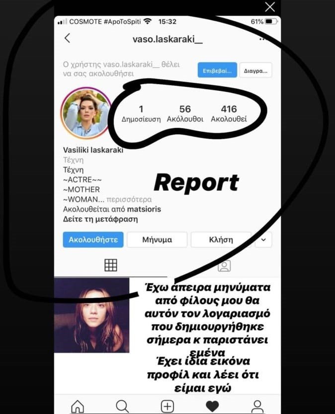 «Έχω άπειρα μηνύματα από φίλους μου για αυτόν τον λογαριασμό που δημιουργήθηκε και παριστάνει εμένα. Έχει ίδια εικόνα προφίλ και λέει ότι είμαι εγώ» έγραψε χαρακτηριστικά η Βάσω Λασκαράκη στη φωτογραφία που ανάρτησε.