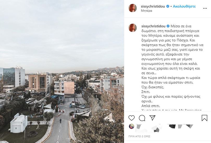 “Και τώρα απλά σκέφτομαι τι ωραία που θα ήταν να ήμασταν σπίτι. Όχι διακοπές. Σπίτι. Όχι με φίλους και παρέες ψήνοντας αρνιά.. Απλά σπίτι. Χωρίς πόνο ή αγωνία. Με βαρεμάρα και χαλαρότητα. Σπίτι. Δεν θα ξεχάσω ποτέ το Πάσχα αυτό. Ούτε τα μαθήματα που πήρα. Καλήμερα αγάπες μου. Χριστός Ανέστη” έγραψε η Σίσσυ Χρηστίδου ανεβάζοντας την παρακάτω φωτογραφία.