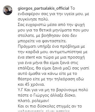 “Το ενδιαφέρον σας για την υγεία μου, με συγκίνησε πολύ. Σας ευχαριστώ μέσα από την ψυχή μου για τα θετικά μηνύματα που μου στείλατε, με βοήθησαν όσο δεν μπορείτε να φανταστείτε. Πράγματι υπήρξε ένα πρόβλημα με την καρδιά μου, αντιμετωπίστηκε με ένα stent και τώρα με μια προσοχή για ένα μήνα θα είμαι ξανά στις επάλξεις, θα είμαι ξανά μαζί σας γιατί αυτό έμαθα να κάνω είτε με το θέατρο είτε με την τηλεόραση εδώ και 45 χρόνια. Υ.Γ Και για να μη το βαρύνουμε πολύ πέστε ο Γιώργος άλλαξε δίσκο, πλατό, ρολεμαν! Και οι πιο δύσκολες στιγμές αν το καλοσκεφτείς, είναι αστείες.”, έγραψε χαρακτηριστικά αναρτώντας και μία φωτογραφία.