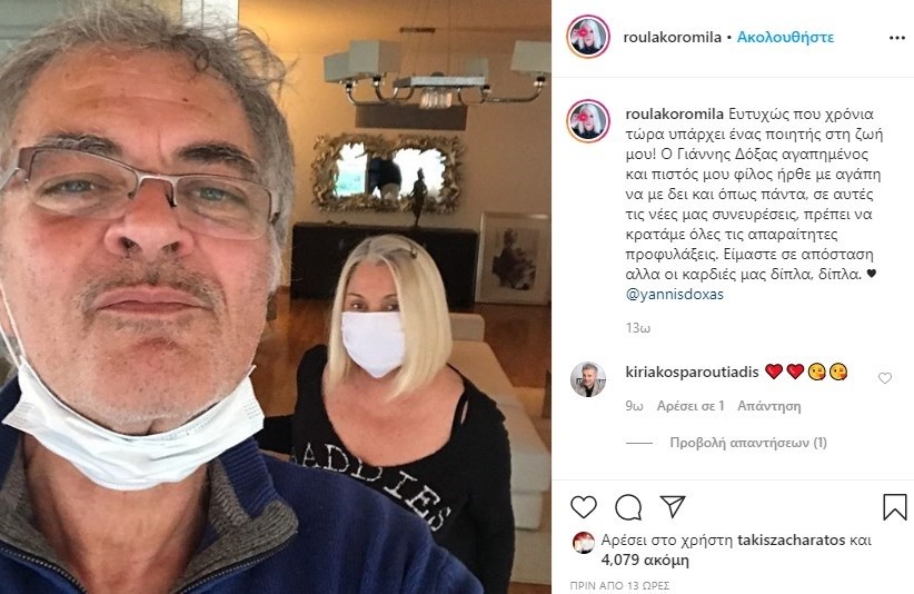 Η Ρούλα Κορομηλά μετά την λήξη της καραντίνας και την πρώτη χαλάρωση των περιοριστικών μέτρων συνάντησε έναν από τους καλούς της φίλους, κρατώντας βέβαια όλες τις προφυλάξεις. Φορώντας μάσκα και διατηρώντας την απόσταση που πρέπει συναντήθηκε με τον γνωστό στιχουργό και φίλο της, Γιάννη Δόξα. Ο Γιάννης Δόξας επισκέφθηκε την Ρούλα Κορομηλά στο σπίτι της και δημοσίευσε και μια φωτογραφία στον λογαριασμό του στο facebook. Αλλά και η ίδια έκανε μια ανάρτηση στον λογαριασμό της στο instagram γράφοντας χαρακτηριστικά “Ευτυχώς που χρόνια τώρα υπάρχει ένας ποιητής στη ζωή μου! Ο Γιάννης Δόξας αγαπημένος και πιστός μου φίλος ήρθε με αγάπη να με δει και όπως πάντα, σε αυτές τις νέες μας συνευρέσεις, πρέπει να κρατάμε όλες τις απαραίτητες προφυλάξεις. Είμαστε σε απόσταση αλλά οι καρδιές μας δίπλα, δίπλα”.