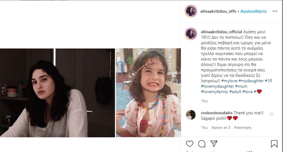 Η ηθοποιός ανέβασε φωτογραφίες της κόρης της και της έστειλε και μέσω social media τις ευχές της: “Αγάπη μου! 18!!!! Δεν το πιστεύω!! Όσο και να μοιάζεις σοβαρή και ώριμη, για μένα θα είσαι πάντα αυτό το ανέμελο, τρελλό κοριτσάκι που μπορεί να κάνει τα πάντα και τους μαγεύει όλους!!! Είμαι σίγουρη ότι θα πραγματοποιήσεις τα ονειρά σου, γιατί ξέρεις να τα διεκδικείς! Σε λατρεύω!” ε΄γραψε η Ελίνα Ακριτίδου με την κόρη της να απαντά: ” Thank you ma!!! Sagapo polli!”