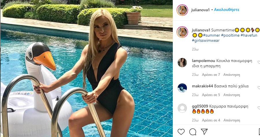Λίγες μέρες μετά την είδηση του χωρισμού της με τον Γιάννη Μάρκου, έπειτα από 12 χρόνια σχέσης, η Tζούλια Νόβα απολαμβάνει το καλοκαίρι και την… εργένικη ζωή. Το μοντέλο δημοσίευσε μια φωτογραφία της με μαγιό, κάνοντας μπάνιο στην πισίνα του σπιτιού πλάι στον ασπρόμαυρο φουσκωτό της κύκνο.