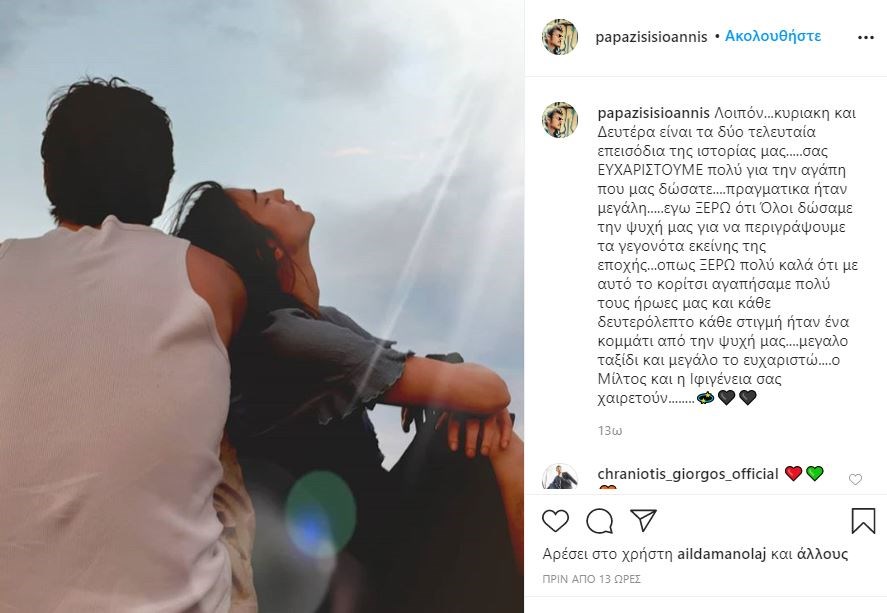 “Λοιπόν… Κυριακή και Δευτέρα είναι τα δύο τελευταία επεισόδια της ιστορίας μας… Σας ΕΥΧΑΡΙΣΤΟΥΜΕ πολύ για την αγάπη που μας δώσατε… Πραγματικά ήταν μεγάλη… Εγώ ΞΕΡΩ ότι Όλοι δώσαμε την ψυχή μας για να περιγράψουμε τα γεγονότα εκείνης της εποχής… όπως ΞΕΡΩ πολύ καλά ότι με αυτό το κορίτσι αγαπήσαμε πολύ τους ήρωες μας και κάθε δευτερόλεπτο κάθε στιγμή ήταν ένα κομμάτι από την ψυχή μας… Μεγάλο ταξίδι και μεγάλο το ευχαριστώ….ο Μίλτος και η Ιφιγένεια σας χαιρετούν….”, ήταν το σχόλιο με το οποίο συνόδευσε τη φωτογραφία που ανέβασε ο Ιωάννης Παπαζήσης.